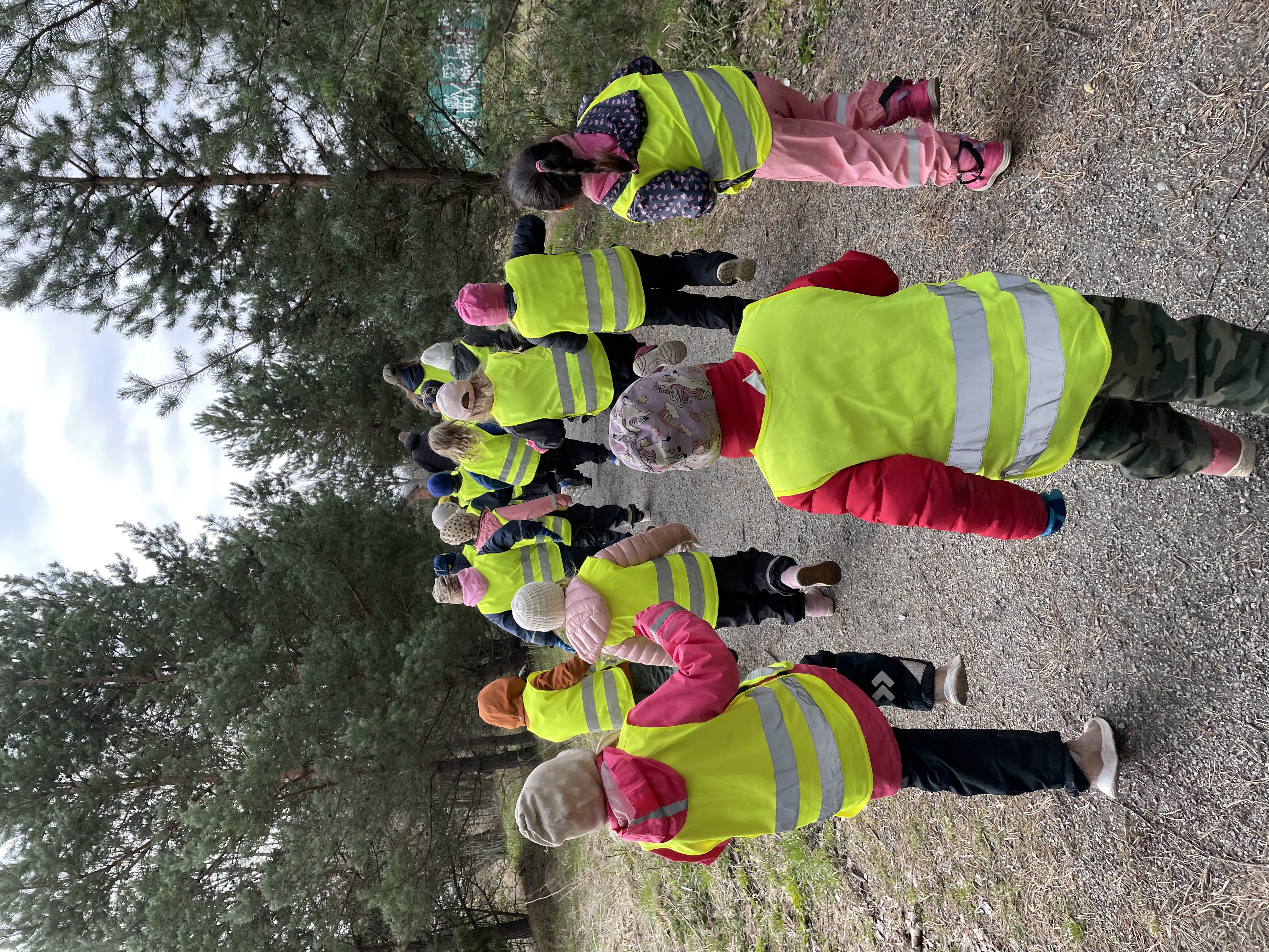Rörelsepromenad, lappar med olika rörelser upphängda längs en väg som vi promenerar.