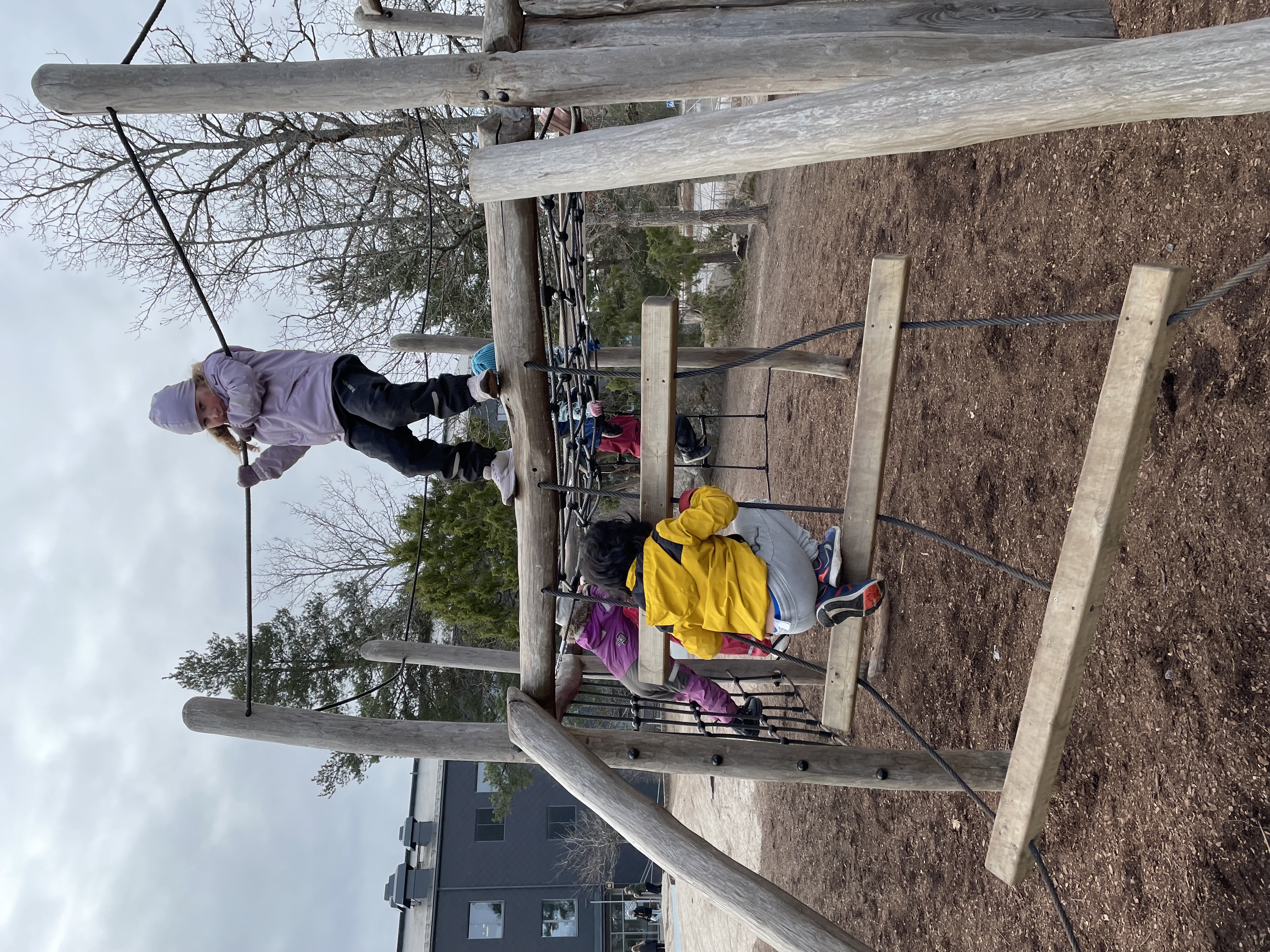 Hinderbana på skolgården, i klätterställningen skulle de ta sig upp och ner på valfritt sätt.