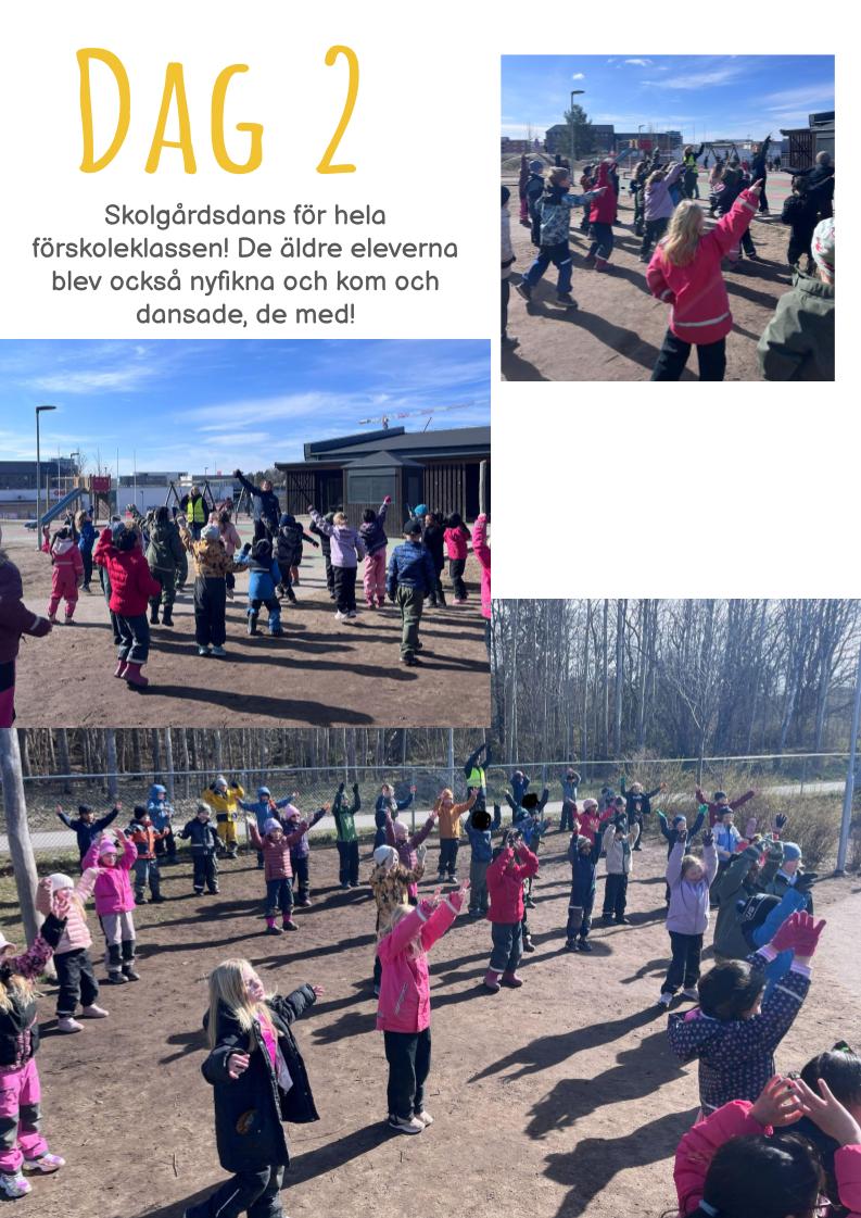 Skolgårdsdans för hela förskoleklassen! De äldre eleverna blev också nyfikna och kom och dansade, de med!