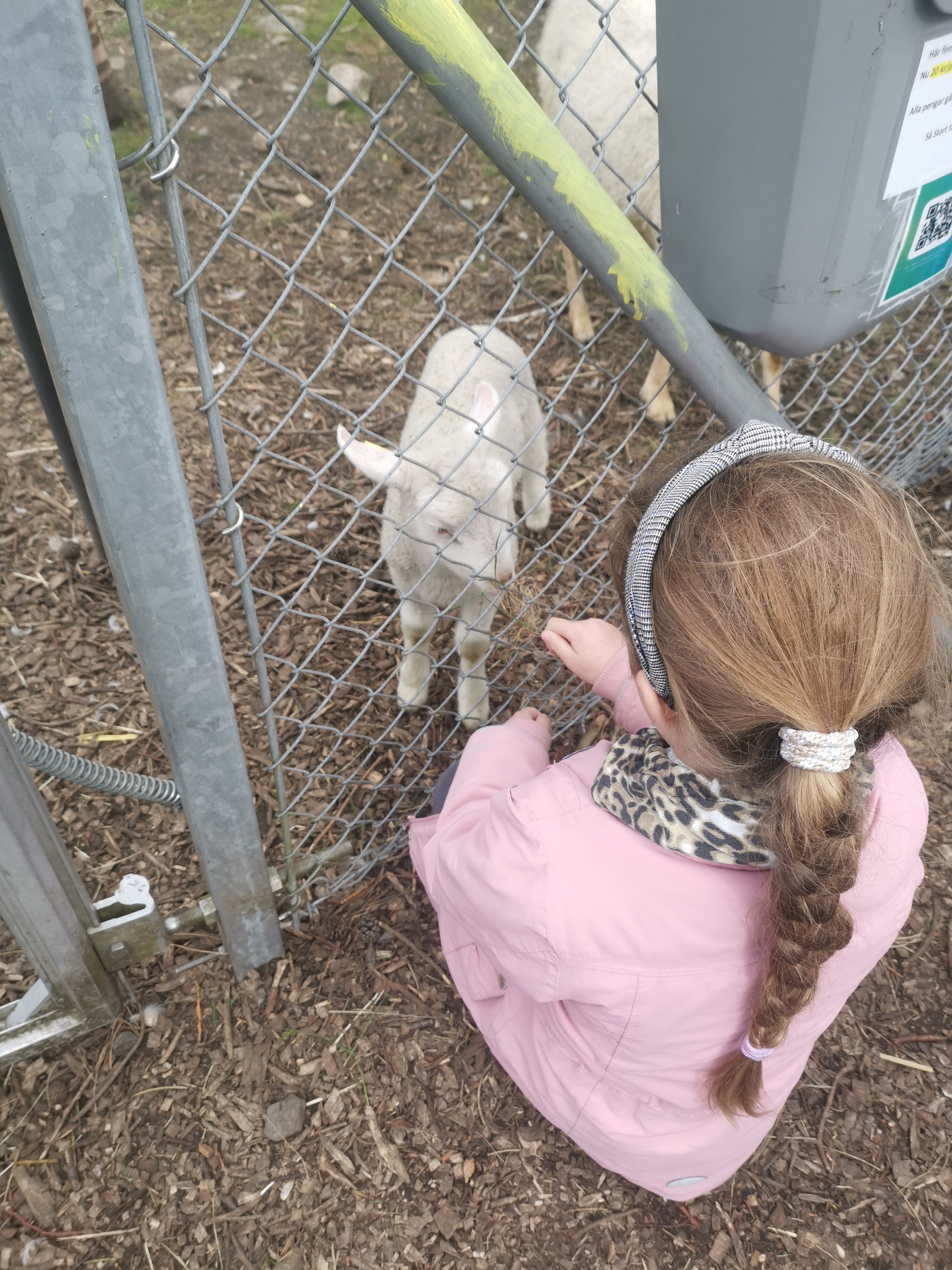 Skolans årskurs 1 och 2 på en gemensam utflykt till att hälsa på lammen.