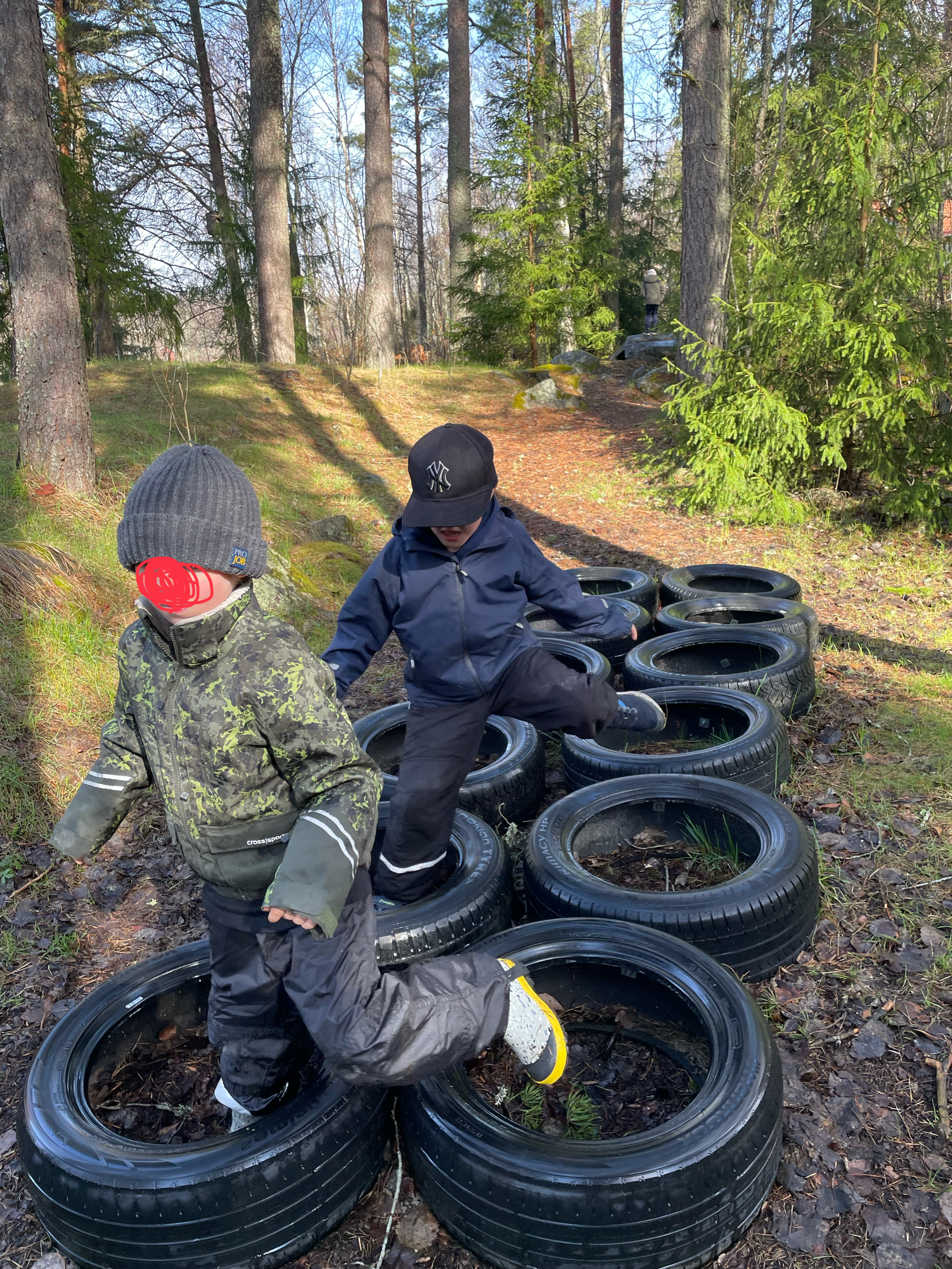 Att sig genom däckhindret är både kul och utmanande för grovmotoriken. Det gäller att ha ”tungan rätt i mun”.