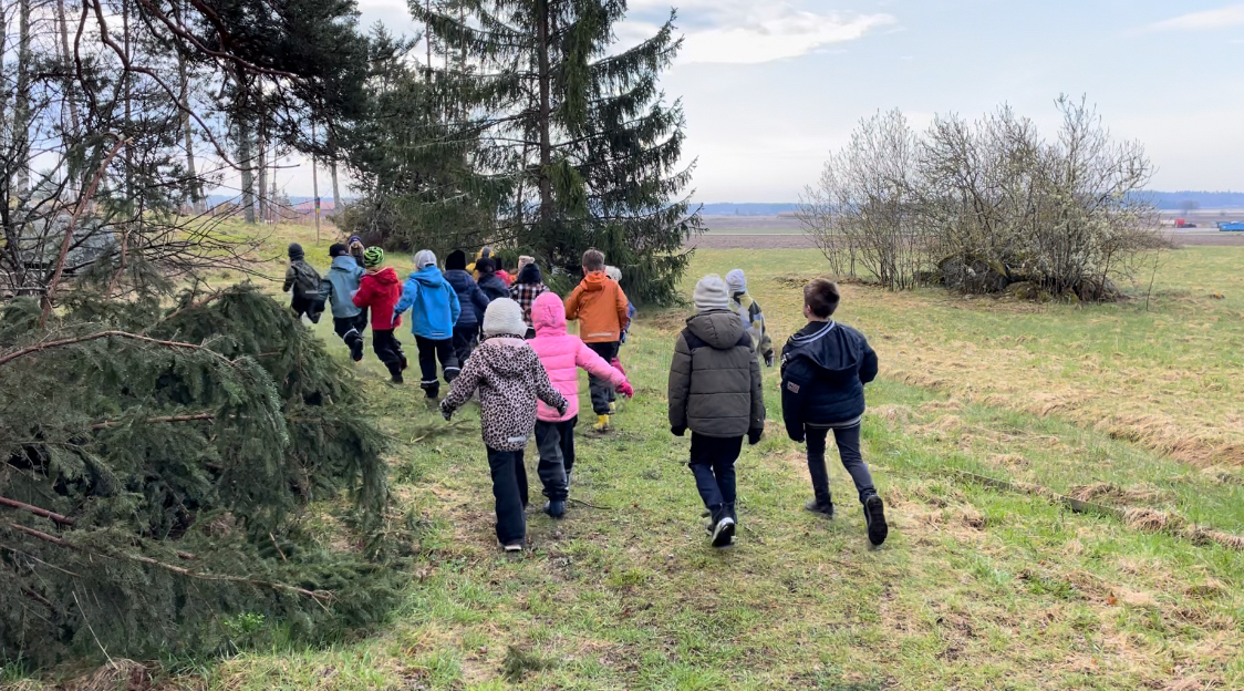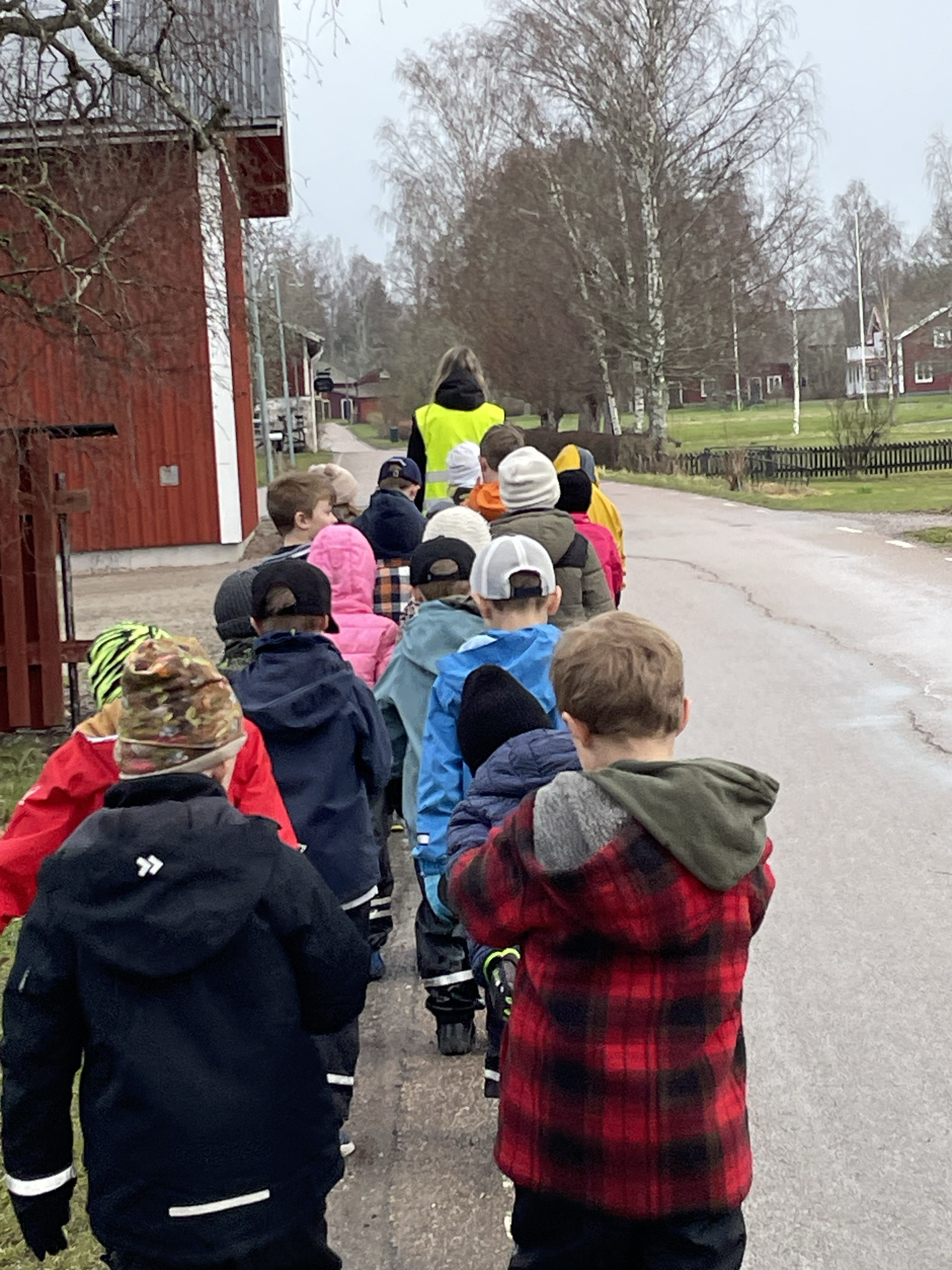 Varje vecka går vi till skogen med klass 1. Promenaden innebär också att få kunskap om att vistas i trafiken på ett säkert sätt och att vara uppmärksam.