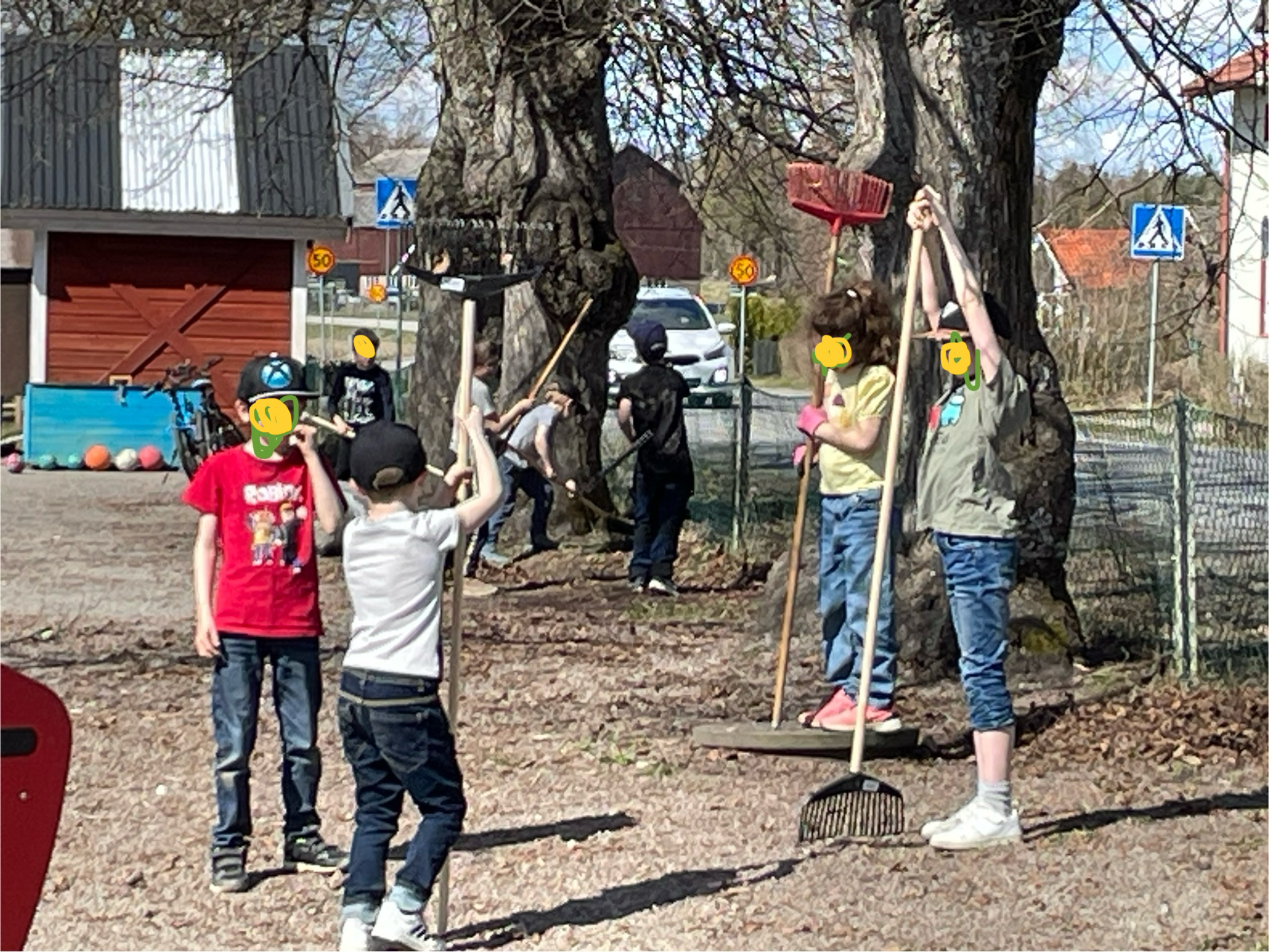 Städning av skolgården så den blir vår-fin. Att kratta, räfsa, sopa, bära kvistar och grenar till byns brasa gav rörelse för hela kroppen.