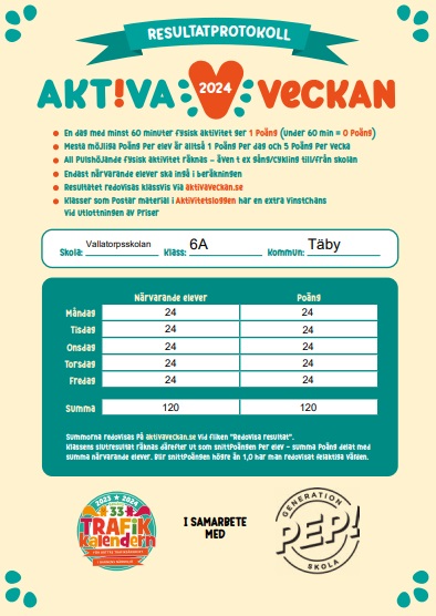 Under vår aktiva vecka har vi tagit hälsan på allvar genom att ge oss ut på energifyllda promenader och utmanande rundor med hjälp av "Active Quiz". För att höja pulsen och sätta våra kroppar i rörelse har vi inte bara nöjt oss med det vanliga – vi har också lagt till extra rörelsepauser med Just Dance och rörelseburken. Resultatet? Vi har inte bara nått utan även överträffat WHO:s rekommendationer om 60 minuters pulshöjande aktivitet varje dag. Med en kombination av roliga aktiviteter och ett engagemang för vårt välmående har vi gjort den här veckan till en triumf för vår hälsa och vårt välbefinnande. Men vår vecka har inte bara handlat om aktiviteter inne i klassrummet eller ute på skolgården. Vi har också strävat efter att integrera en aktiv livsstil i våra dagliga rutiner. Alla elever har tagit ett extra stort ansvar genom att välja att gå eller cykla till skolan istället för att ta bilen eller andra passiva transportmedel. Denna gemensamma insats har inte bara bidragit till att öka vår fysiska aktivitet, utan också minskat vår miljöpåverkan. Genom att välja att röra på oss på vägen till och från skolan har vi inte bara satt ett exempel för en hälsosam livsstil, utan även tagit ett steg mot att minska vår kollektiva koldioxidutsläpp. Det är fantastiskt att se hur vi tillsammans kan göra positiva förändringar för både vår hälsa och planeten! | ||