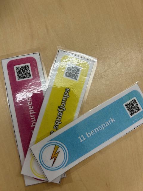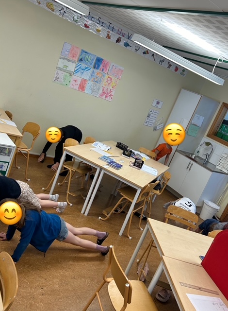 Rörelsepauser, vi drar lott vilka övningar vi ska göra för att variera övningarna.